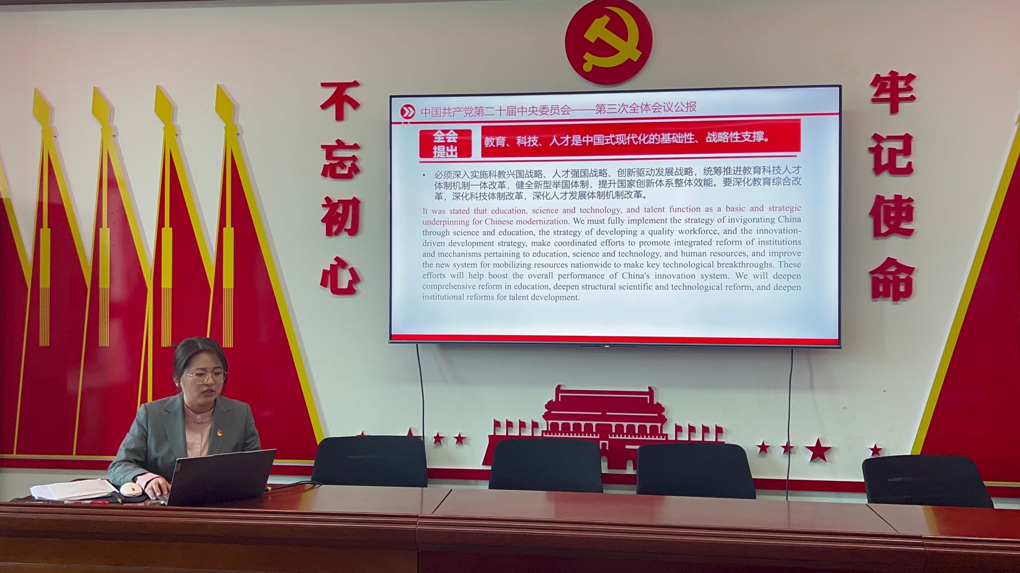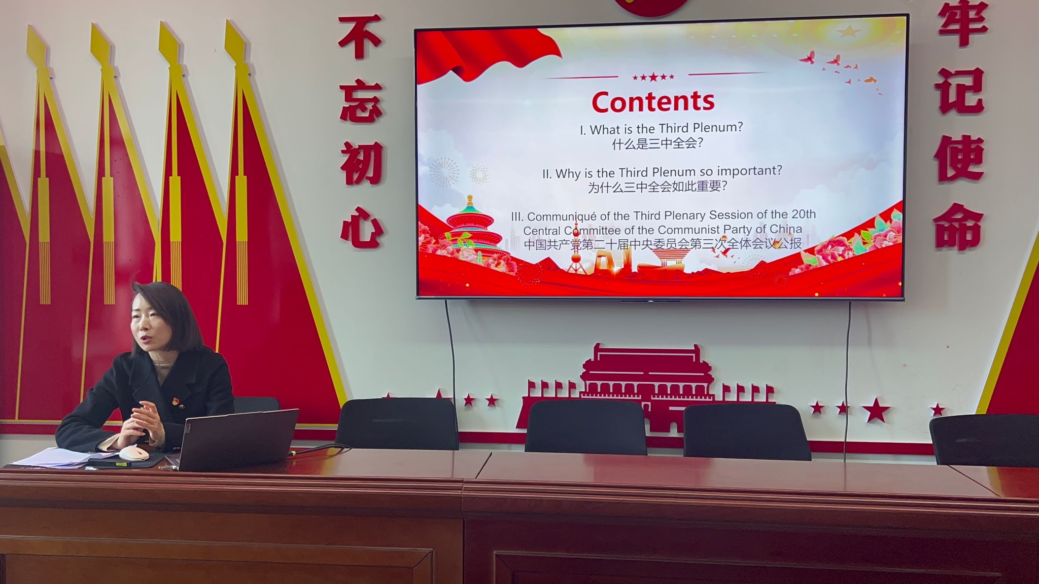 11月20日下午,91在线 在学院党建活动室举行“双语讲党课--党的二十届三中全会精神宣讲”活动。学院师生党员代表参加了活动。活动由院党委书记梁艳主持。