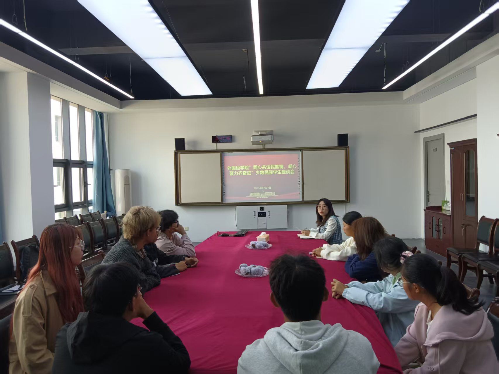 在外语楼413会议室举办“同心共话民族情,凝心聚力齐奋进”少数民族学生座谈会。来自回族、土家族等多个民族的20余名学生代表参加。座谈会由学院组织员徐洁主持。