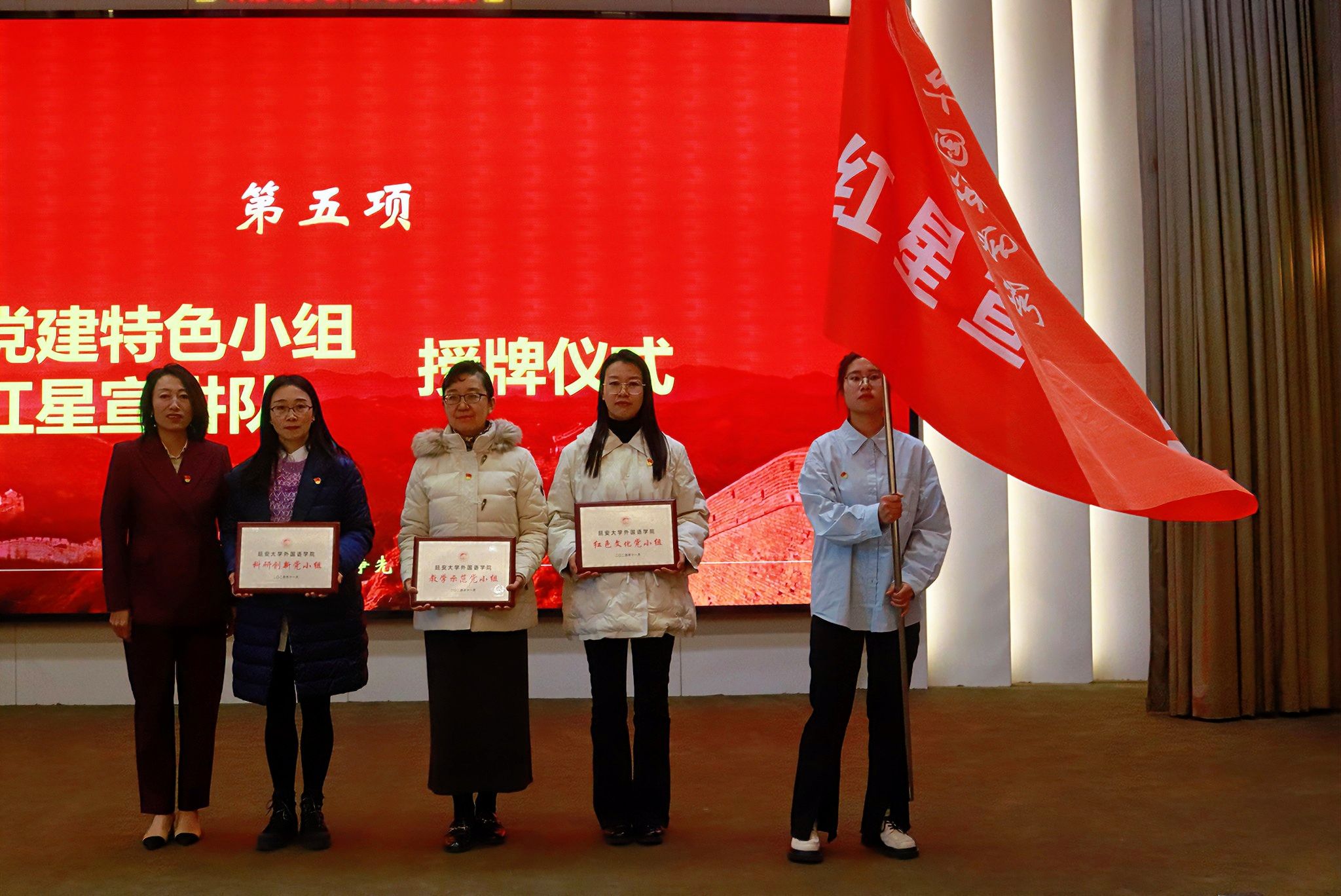 实践教学指导教师”聘书,同时向叶友珍、惠霞、王雨薇分别颁授了“科研创新党小组”“教学示范党小组”和“红色文化党小组”工作牌匾,向“红星宣讲队”队长李晨洁同学颁授了队旗。
