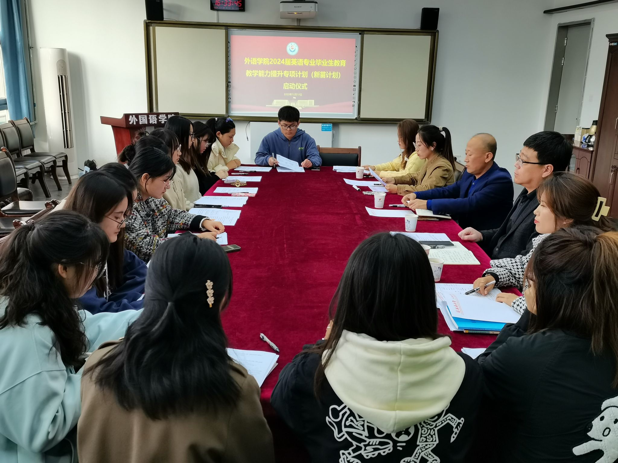 在外语楼会议室举行英语专业毕业生教育教学能力提升专项计划启动仪式。参加启动仪式的有学院教学副院长李世荣、党委副书记许多文、学院校外就业指导教师、延安市新区一中刘静老师、辅导员郭芯萌和入选本次计划的2020级英语专业本科生。启动仪式由许多文主持。