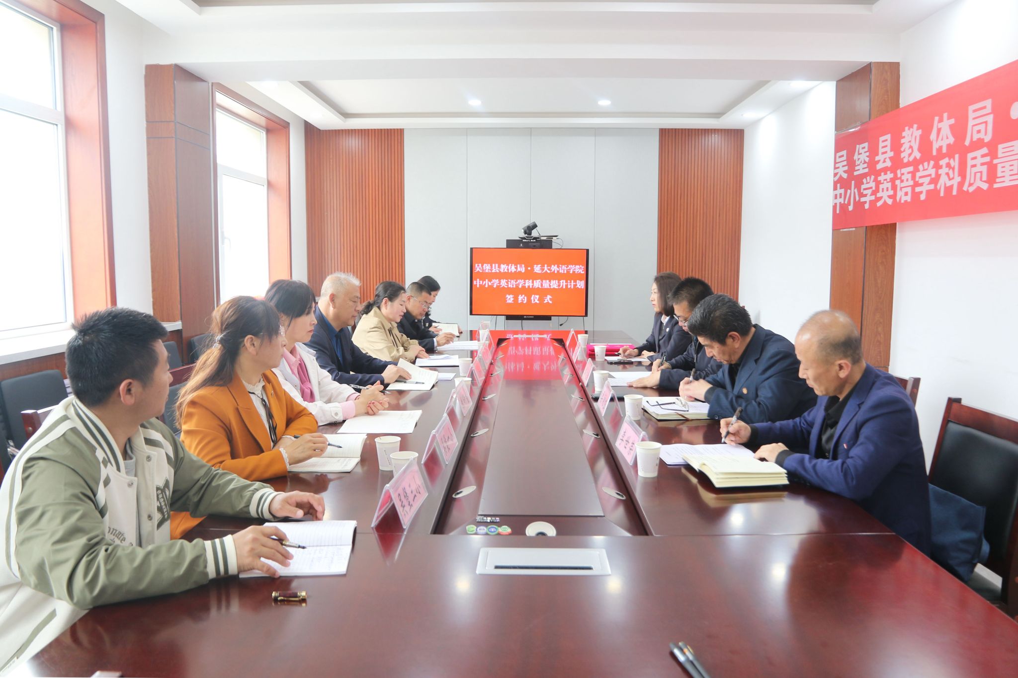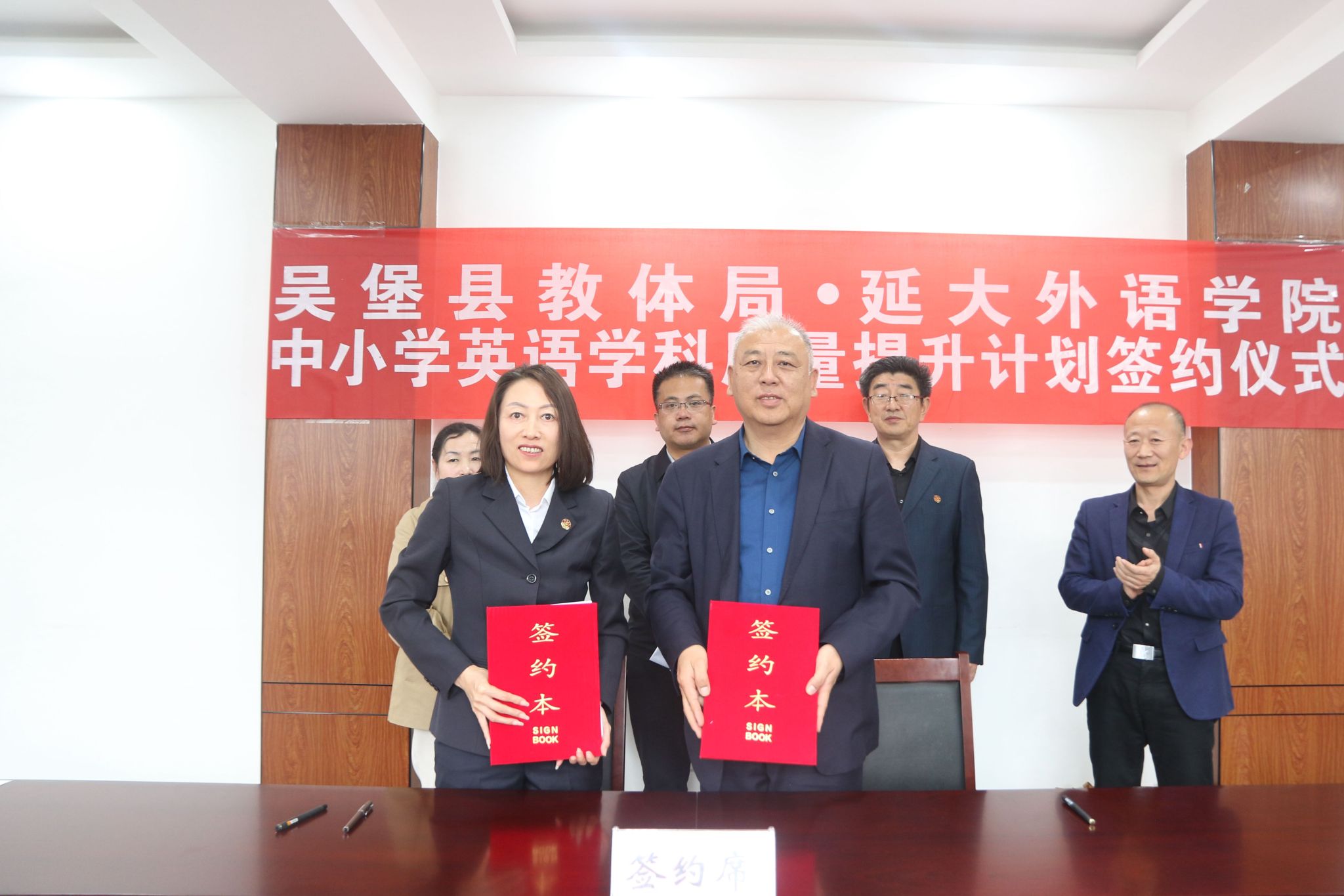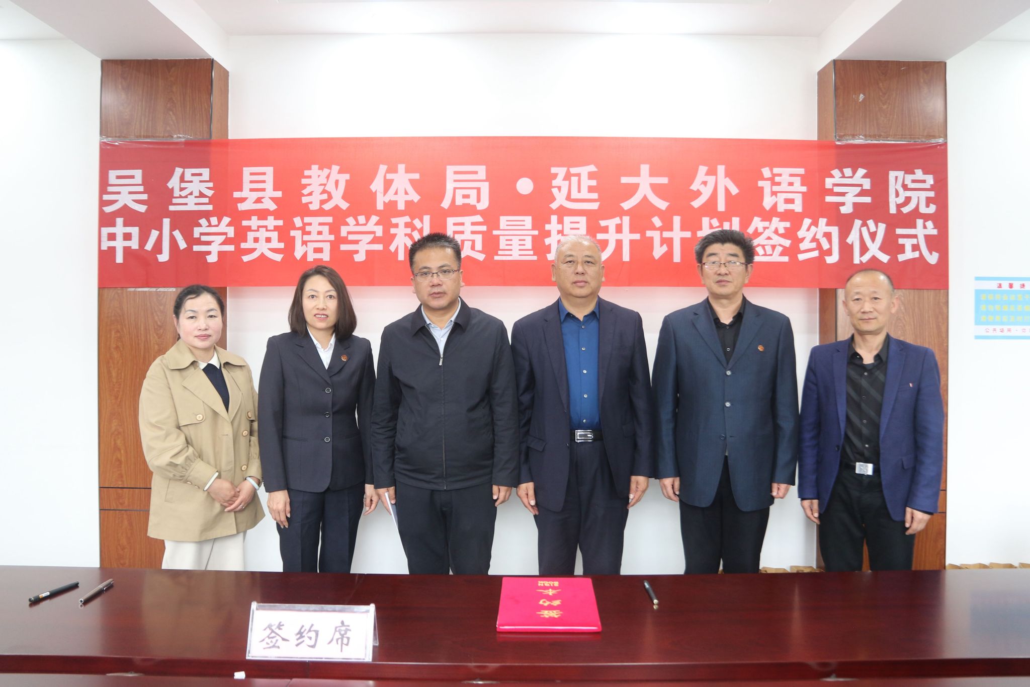 与吴堡县教体局“中小学英语学科教学质量提升计划签约仪式”在吴堡县教体局举行。我校副校长谭虎娃,外国学院院长梁润生、党委书记梁艳、副院长李世荣,吴堡县政协副主席、教体局局长宋琦辉,吴堡县教体局、教研室相关负责人以及吴堡县部分中小学校负责人参加了仪式。仪式由吴堡县教体局副局长宋芳艳主持。