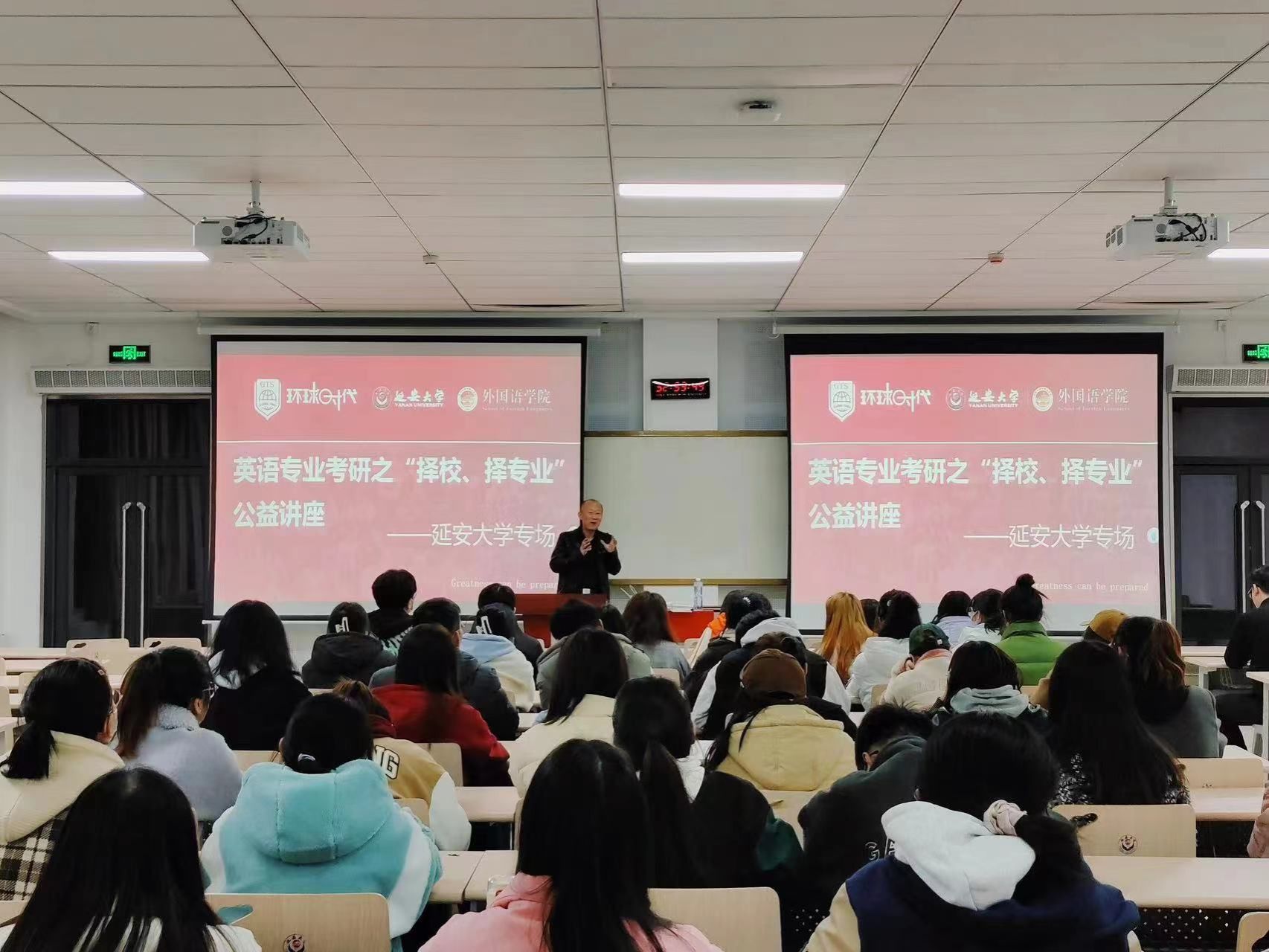 为帮助学院有考研意愿的学生了解考研政策、制定合理考研计划,提升考研自信心,3月24日晚7点,学院邀请北京环球时代西安分公司的鲁博博教授在外语楼107教室进行英语专业考研专题讲座。学院副院长李世荣、教务员汪洁和英语专业100余名学生参加了讲座。讲座由李世荣副院长主持。