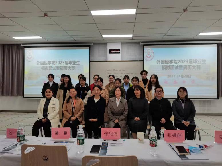 举行了2023届模拟招聘会,特邀就业指导中心刘瑶老师、外语学院优秀校友贺星和学院5位专业老师担任本次活动评委。本次大赛共评选出15份优秀简历,12位优秀应聘者,最终获奖同学为:一等奖林飞燕,二等奖赵熙、张悦娥,三等奖吴泽涵、李欢、祝航。此次大赛围绕简历制作、自我介绍,对岗位认知个人展示,试讲,评委老师提问等环节,让同学们全方面掌握求职技巧,提升就业能力,从容面对职场挑战,赢得职场未来!