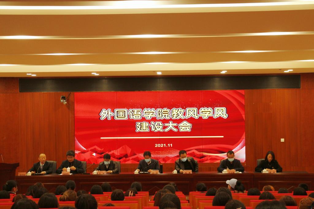 在行政楼举行教风学风建设大会。副校长吕达、教务处处长吕磊、研究生学院院长王文强、学工部部长张翔到会祝贺。外语学院领导、全体师生参加。大会由李世荣副教授主持。