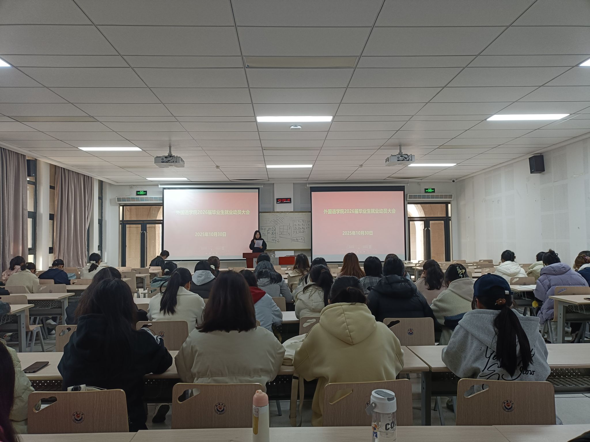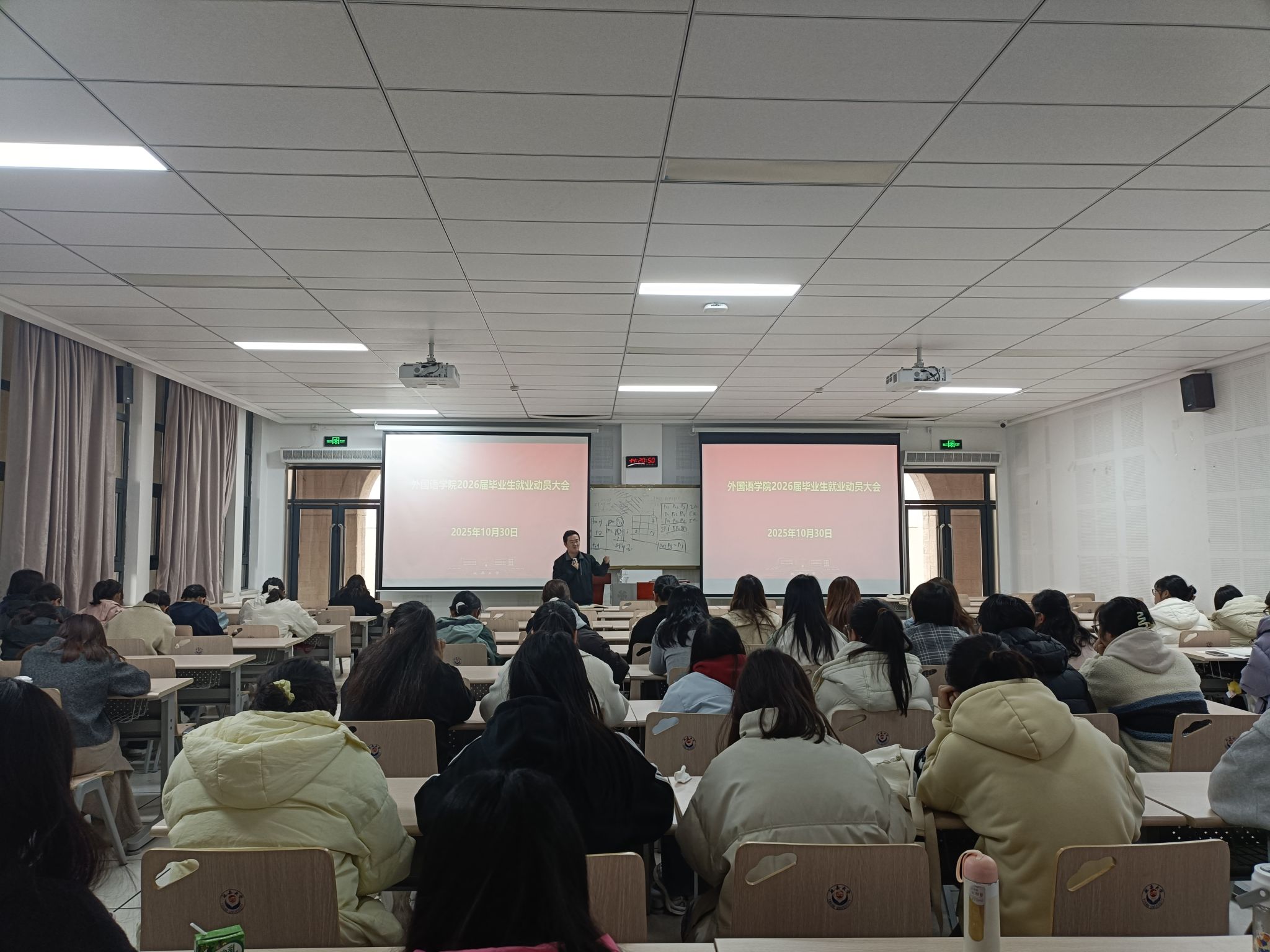 为帮助毕业生明晰就业形势、把握就业机遇,10月30日下午,学院在外语楼107教室举行2026届毕业生就业动员大会。学院党委副书记姜家兴、就业专职辅导员徐洁及2026届全体毕业生160余人参加了本次会议。会议由徐洁主持。