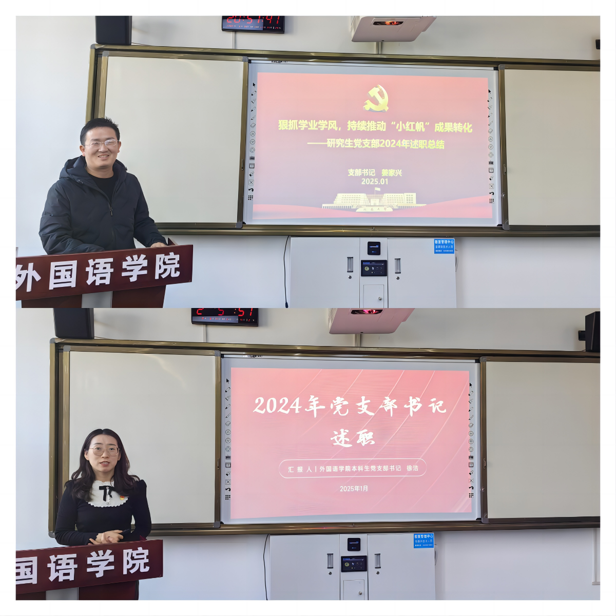 会上,教工第一支部书记李艳、教工第二支部书记高治东、研究生支部书记姜家兴、本科生支部书记徐洁、从“2023年查摆问题及整改措施、2024年重点任务完成情况、党建特色与亮点、2025年工作计划”等四个方面进行了述职。