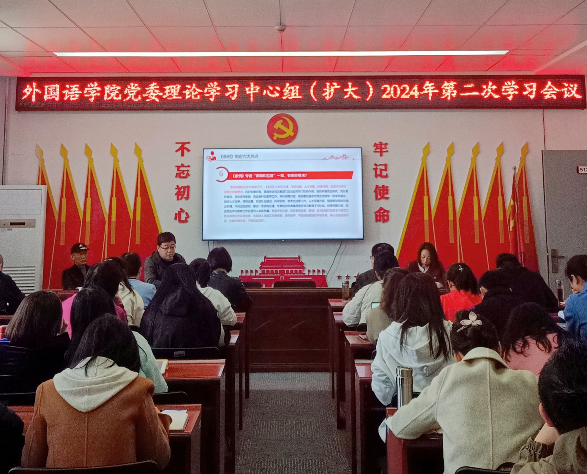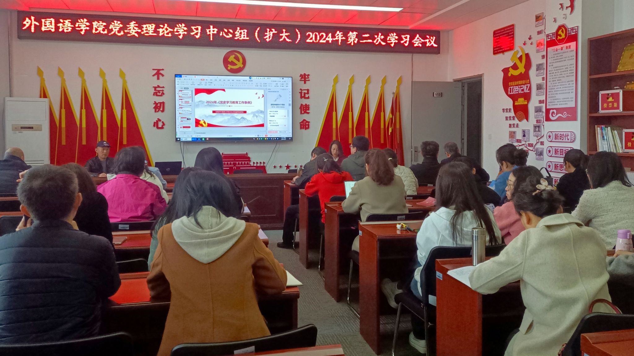 在学院党员活动室举行了理论学习中心组(扩大)2024年第二次学习会议。学院领导班子、全体教工党员参加了会议。会议由院党委书记梁艳主持。