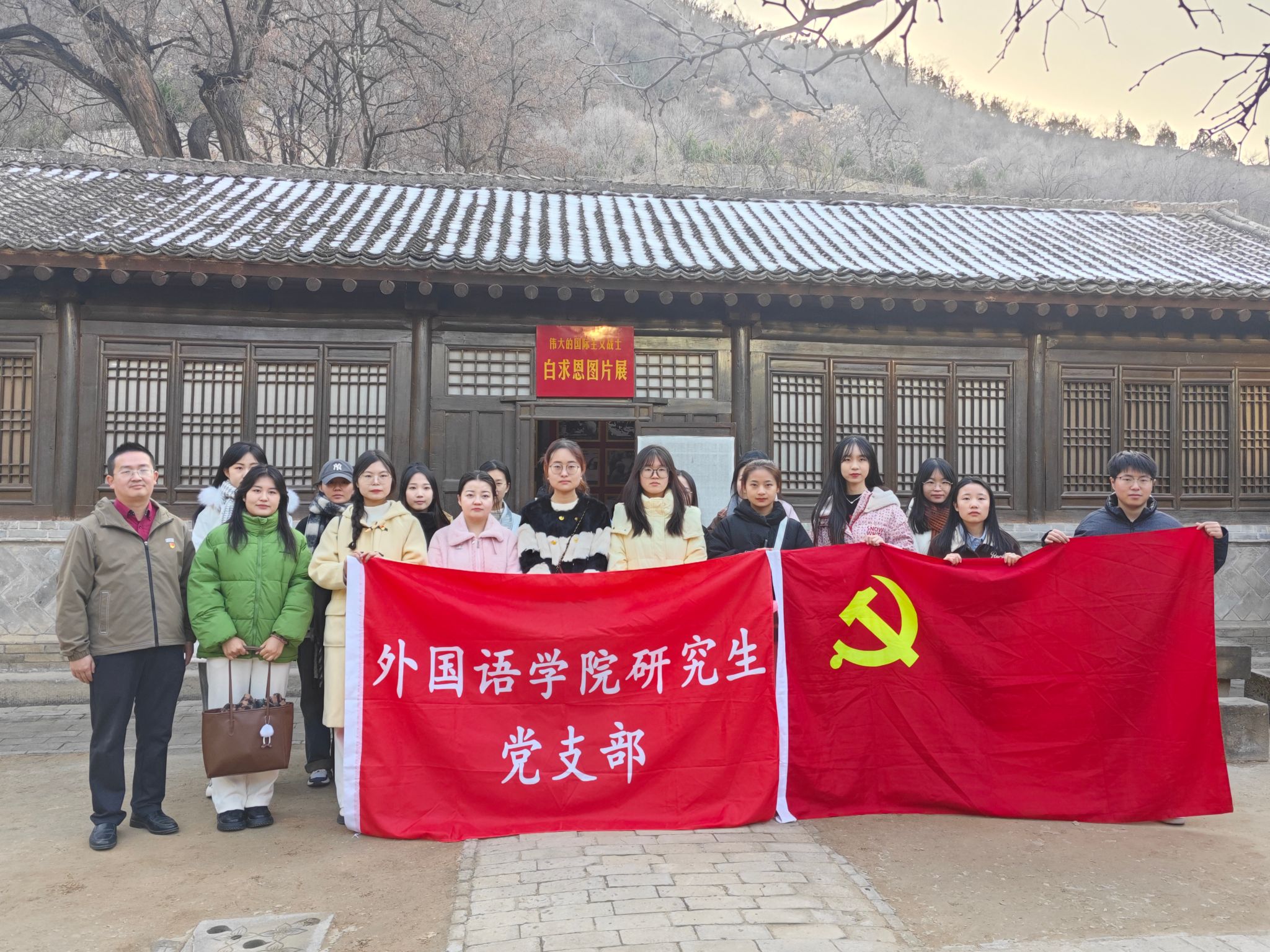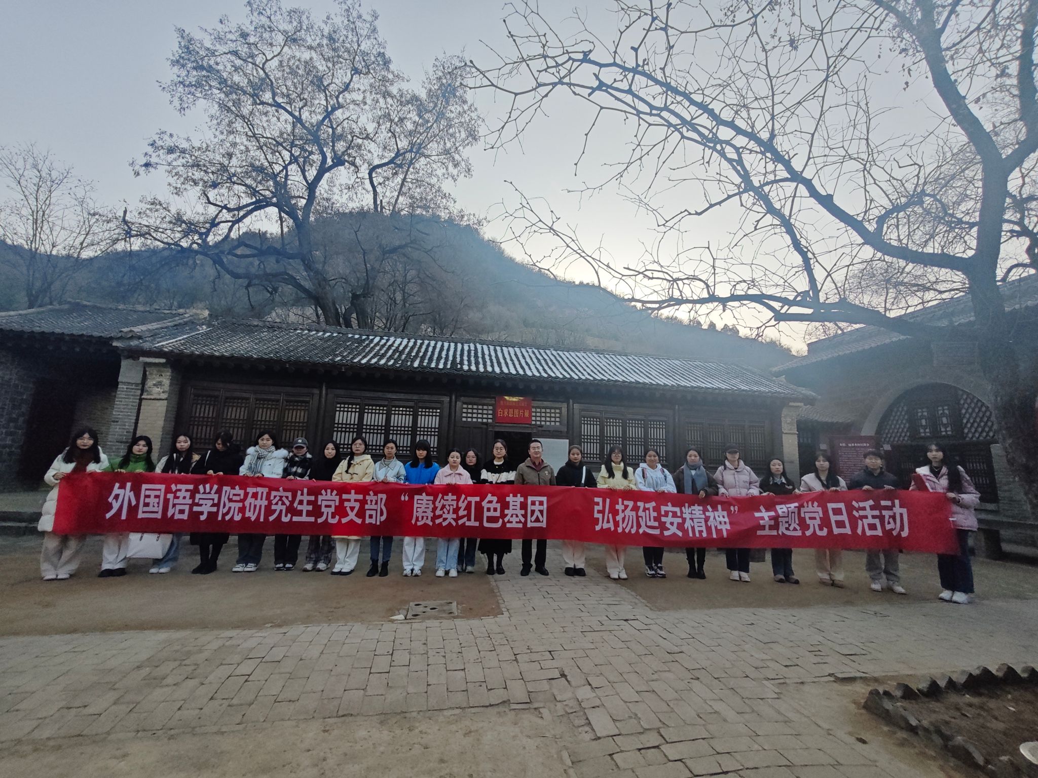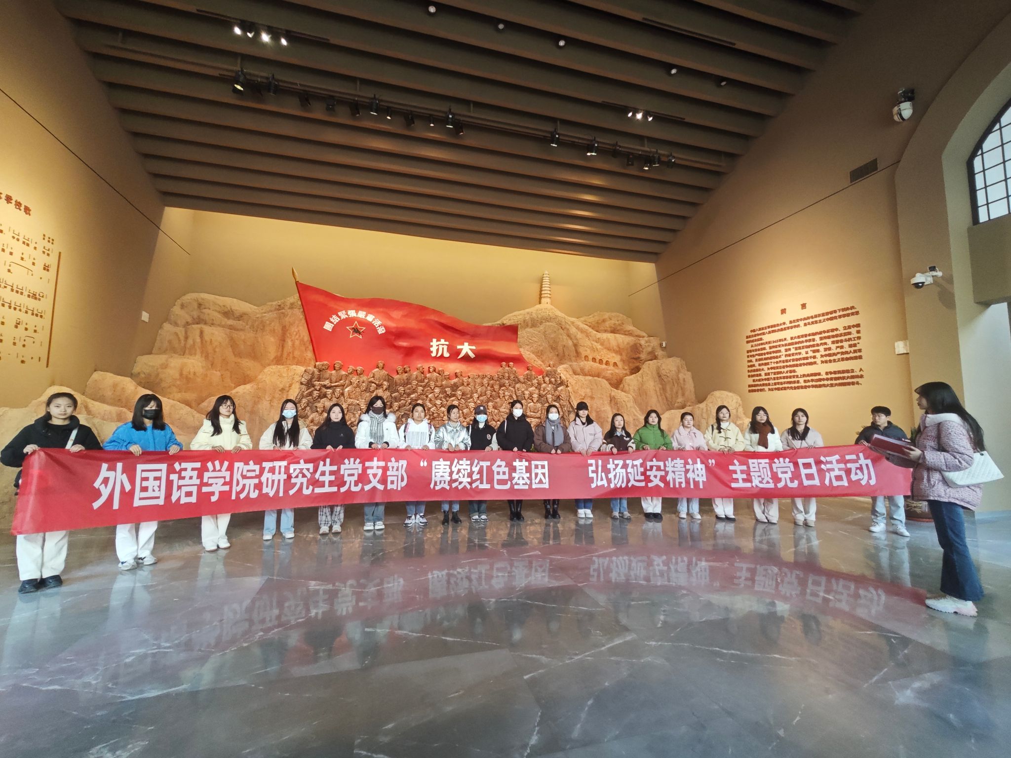 首先,全体在讲解员的带领下参观了参观了抗大纪念馆及凤凰山革命旧址中的毛泽东、周恩来、朱德等领导人旧居及红军参谋部旧址;随后,研究生党支部书记姜家兴作了题为《延安时期的青年运动》的现场教学;接着,杨少敏等同学用中英文讲解了《纪念白求恩》,丁晨瑶等同学对旧址简介及标志牌进行了现场校正和翻译;最后,大家举行了重温入党誓词仪式。