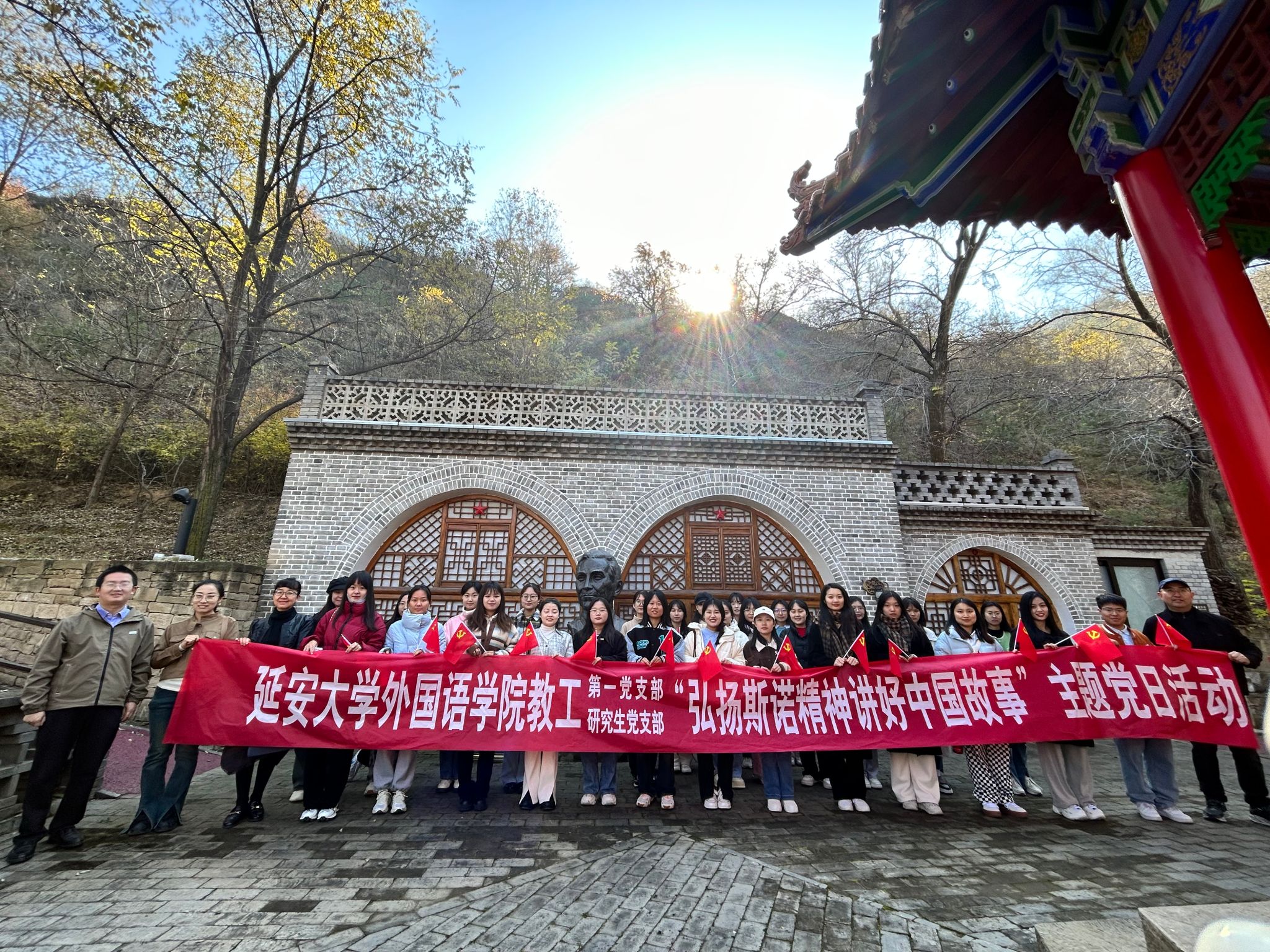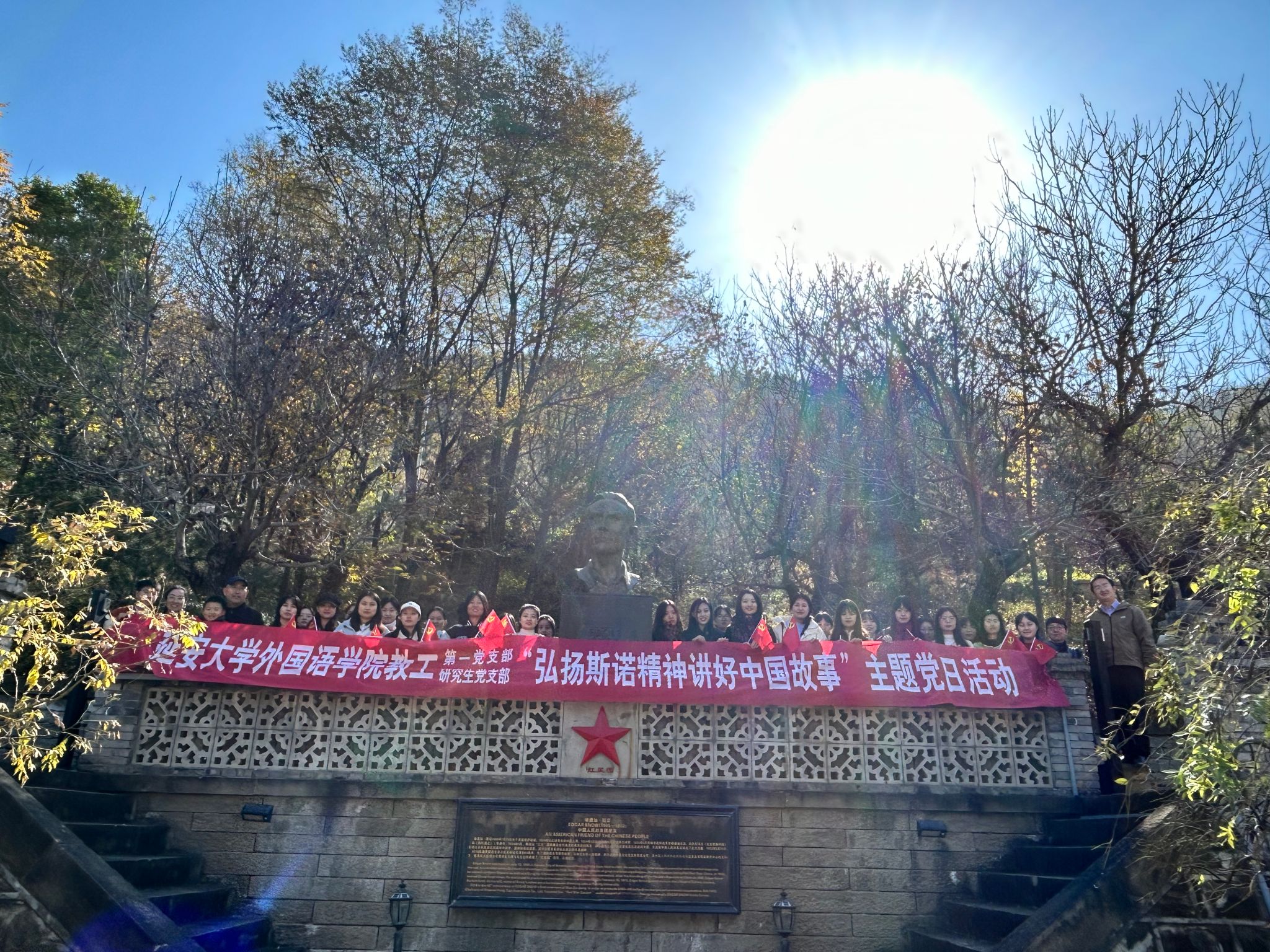 教工第一党支部与研究生党支部前往延安“红星园”联合开展“弘扬斯诺精神,讲好中国故事”主题党日活动。教工第一党支部成员惠霞、常琅、郭芯萌,研究生党支部书记姜家兴,及研究生党支部成员参加了活动。活动由张研珂主持。