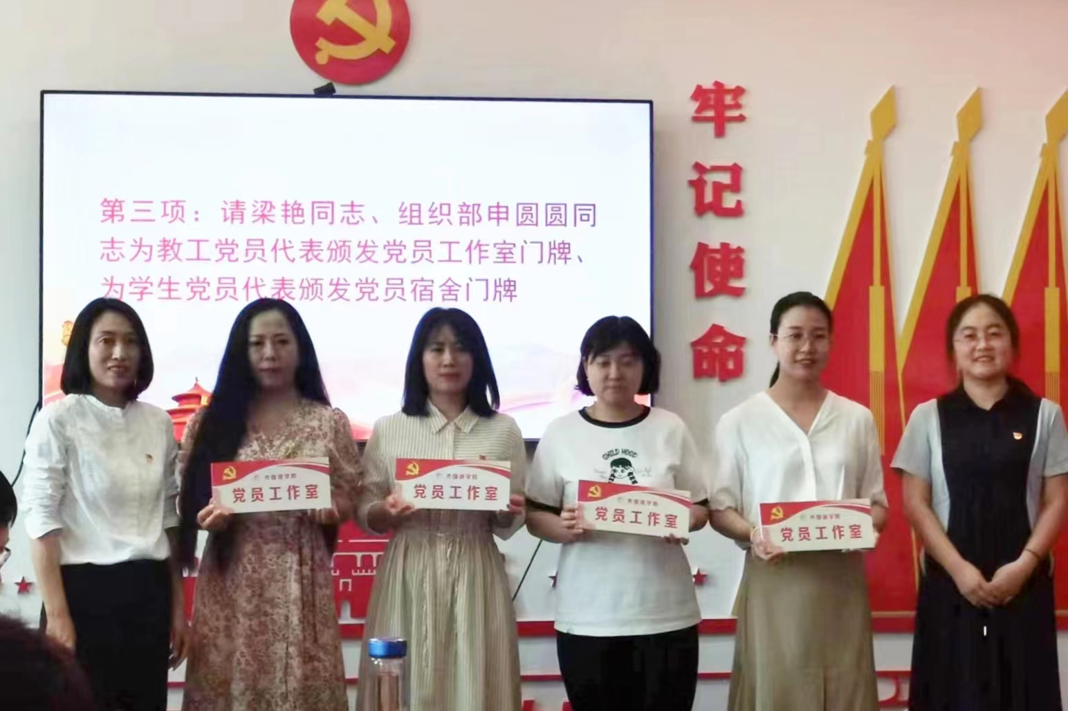 伴随着庄严的《国歌》声,活动拉开了序幕;随后,梁艳、申圆圆分别向全体师生党员赠送了政治生日贺卡,为党员教师颁发了“党员工作室”门牌,为学生党员颁发了“党员宿舍”门牌;接着,教师代表张娅萍、学生代表张悦娥作了表态发言,表示将牢记党员身份、努力奋勇争先,自觉成为学院师生学习的榜样、工作的楷模、研学的标杆,不辜负党组织的殷切期望。随后,申圆圆、梁艳及学院班子成员分别为教师党员、学生党员举行了挂牌仪式。