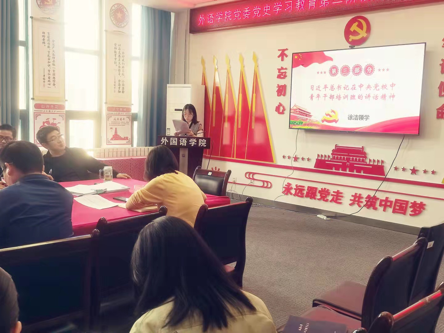 首先,全体成员以视频方式学习了习近平总书记在陕西榆林考察期间的重要讲话精神;接着,姜家兴领学了校党史学习教育领导小组办公室发《关于认真学习贯彻习近平总书记“七一”重要讲话精神的通知》,徐洁领学了习近平总书记在中央党校中青年干部培训班的讲话精神,郭芯萌领学了习近平总书记在中央民族工作会议上的讲话精神;接着,副院长李艳、韩峰就分管工作作了安排部署;随后,院长梁润生在讲话中畅谈了前一阶段党史学习教育的工作体会,要求全体教职工要在党史学习教育中汲取力量,要在学习习近平总书记系列重要讲话中启迪智慧,把学习成果转化为工作动力、发展潜力、学院凝聚力,以时不我待、只争朝夕的精神面貌主动投入到学校和学院发展建设中来,为助力学院“十四五”规划目标的顺利实现添砖加瓦。