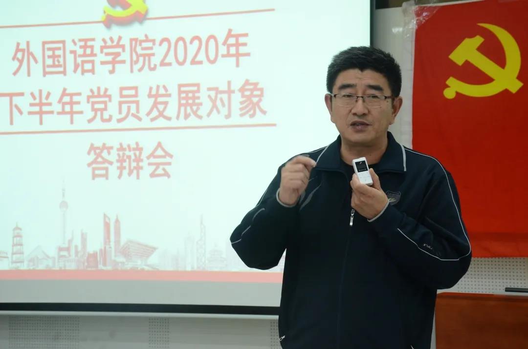 在外语楼211教室举行2020年下半年学生党员发展对象答辩会。学院院长兼党委副书记梁润生、教工第一支部书记李艳、教工第二支部书记高治东、研究生支部书记姜家兴、本科生支部书记徐洁担任评委。学院第56和57期入党积极分子共计100余人观看了答辩会。