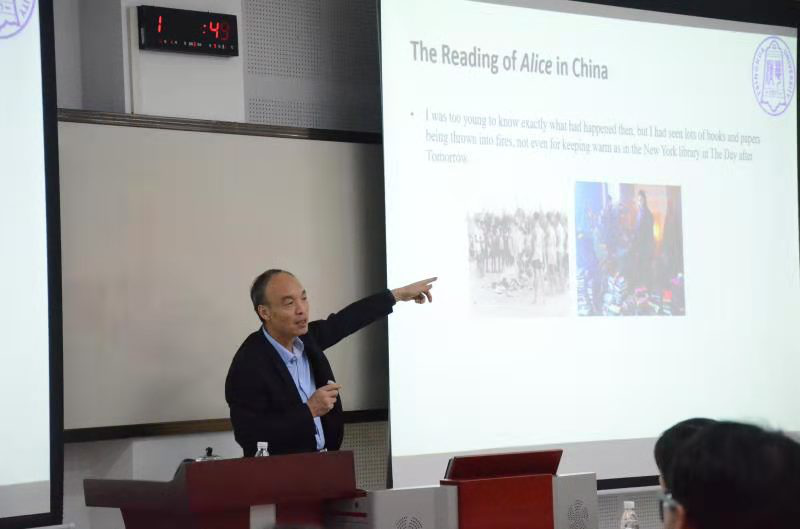 11月4日晚上7:00,封宗信教授作了题为“百年经典翻译与跨学科研究”的报告。封教授以儿童文学经典《爱丽丝漫游奇境记》的翻译为例,分析了不同翻译版本在语言学、文学批评、符号学、逻辑学、修辞学、计算机等跨学科领域的翻译风格和特征,阐释了百年文学经典的翻译研究价值及跨学科研究思路。封教授博学睿智,讲座将理论哲思与语言生活紧密结合,给予师生在读书和为学方面的思考。