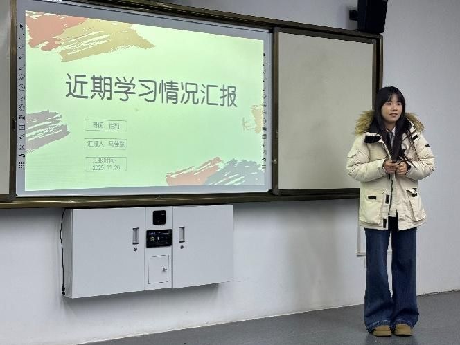 随后,2025级研究生李娜与马佳慧分别就入学以来的学习进展进行了专题汇报,分享了在文献研读、学术讲座学习及教学案例观摩中的收获与反思,并重点围绕人机对话测评优化与英语听说教学创新等话题,与导师组展开了深入讨论。导师组对两位同学自入学以来积极主动的学习态度和初步的学术积累给予肯定,同时对全体同学提出了进一步的期望:鼓励大家在现有学习基础上不断拓宽学术视野,加强英文文献与专业著作的研读,积极吸收国际前沿研究成果与思路,持续夯实理论基础,为后续科研实践与教学探索打下更加坚实的根基。